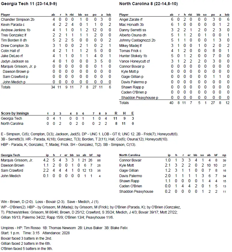 UNC left 12 runners stranded and was 1 of 7 with runners in scoring position, a few times hitting hard balls right at fielders. Jackets starter Marquis Grissom Jr. got out of a bases-loaded, two-out jam in the second inning when Angel Zarate lined out to center field.