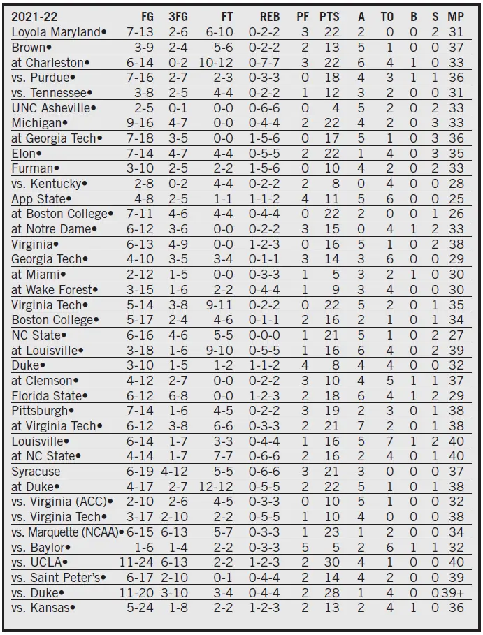 Love was UNC’s leading scorer in its 29 wins at 17.4 points per game. The Tar Heels went 27–6 when he scored in double figures, 13–0 when he scored at least 20 points, 20–4 when he had more assists than turnovers, 14–0 when he had at least five assists and 23–4 when he had multiple 3-pointers.