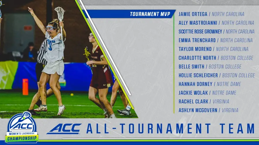 Ortega notched four goals and a championship-game-record five assists to become the ACC’s all-time leading points scorer at 451 points and Growney scored four goals. Ortega’s nine points tied the championship-game record.