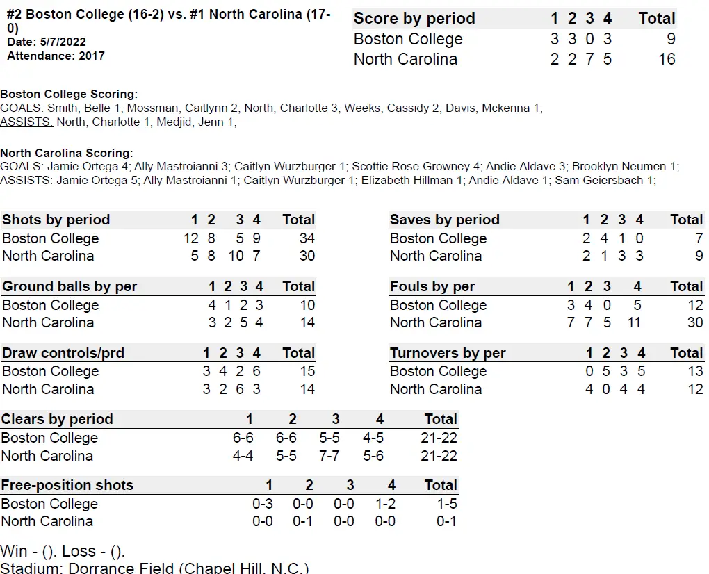 The Tar Heels, who had 10 of their 16 goals assisted, took control with four goals in the first 3:17 of a rainy third quarter. Fueled by Ortega’s two goals and two assists, UNC outscored BC 7–0 in the quarter after scoring with four seconds left in the first half.