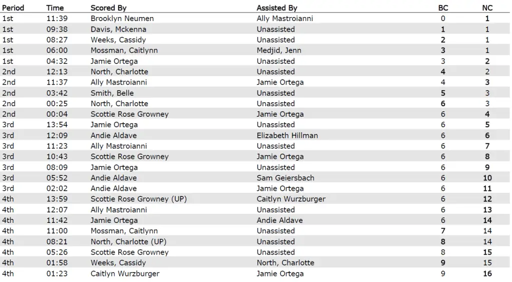 The teams traded goals in the last 25 seconds of the first half with North scoring on a driving shot and Growney scoring at close range off of an Ortega assist with 4.4 seconds left as BC took a 6–4 halftime lead.