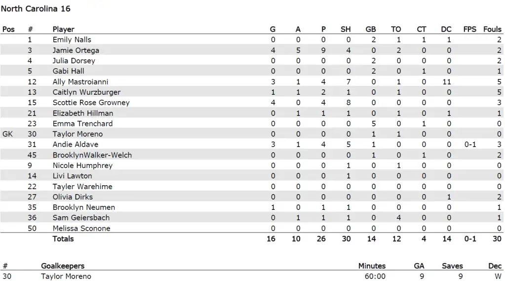 She was no match for the Tar Heels’ incredible third-quarter offensive assault as they rallied from a three-goal deficit with 11 consecutive goals for 16–9 victory Saturday night and their league-record 18th consecutive ACC tournament win.