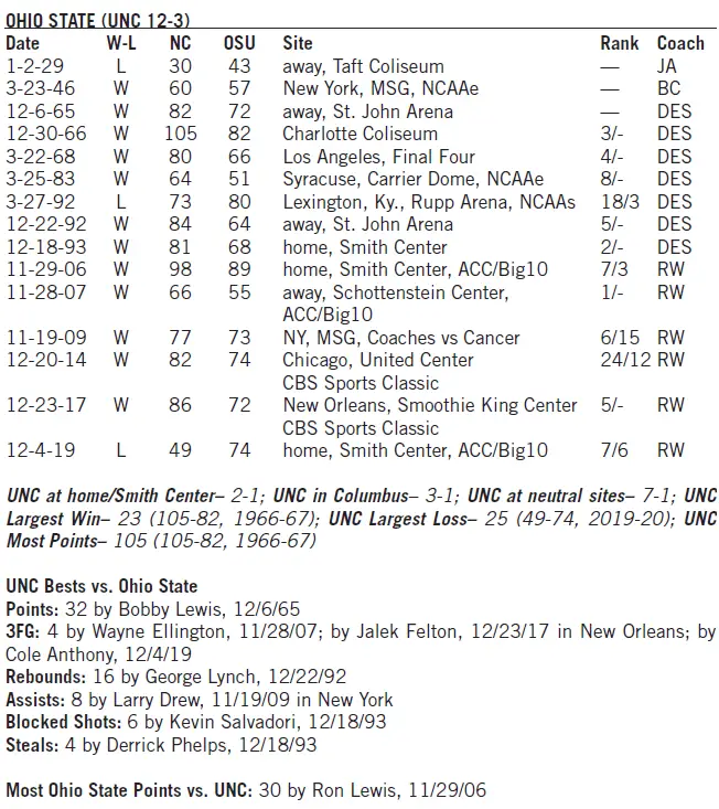 The No. 6-ranked Ohio State blew out No. 7 UNC 74–49 in their last meeting as part of the 2019 ACC/Big Ten Challenge at the Smith Center. Carolina leads the all-time series 12–3.