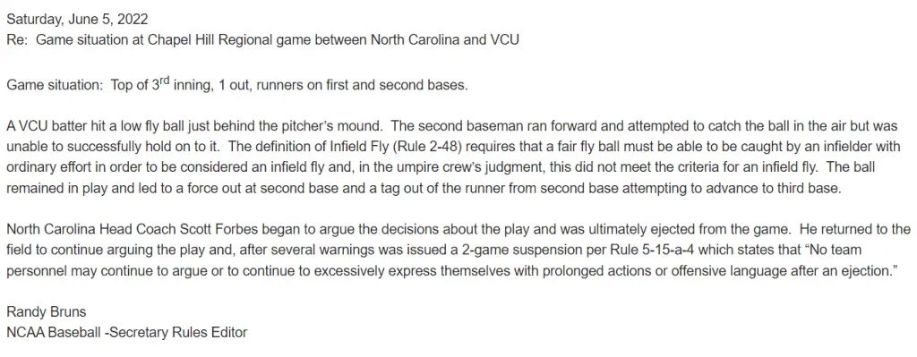 Henrichs ejected Forbes for protesting after an infield-fly rule wasn’t called on a third-inning, one-out play when UNC had runners at first and second.