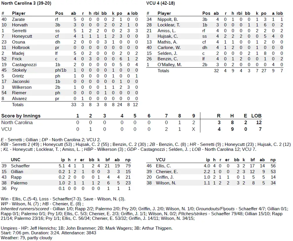 After a pair of questionable umpire decisions ended early Tar Heels scoring threats, repeated failures with runners on base helped Virginia Commonwealth pull out a 4–3 victory Saturday night before 3,843 fans at Boshamer Stadium to extend the Rams’ win streak to 17 and end UNC’s streak at eight.