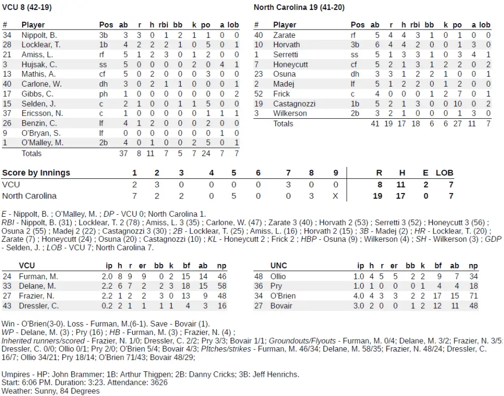 VCU took a brief lead on Tyler Locklear’s two-run homer in the top of the first. But the first four Tar Heels got hits in the bottom of the first in the highest-scoring first inning of the season, as Johnny Castagnozzi’s solo shot followed Honeycutt’s blast.
