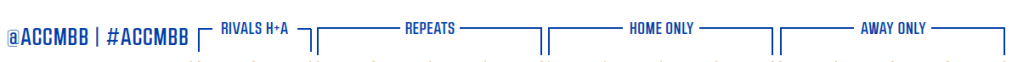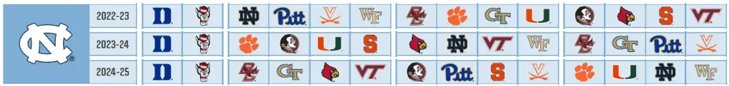 In the 2024–25 season, Carolina takes on BC, Georgia Tech, Louisville and Virginia Tech home and away, FSU, Pitt, Syracuse and Virginia at home and Clemson, Miami Notre Dame and Wake Forest on the road.