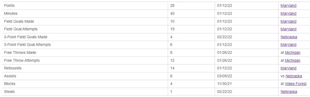 Nance has eight career double-doubles, with career-highs of 28 points and 14 rebounds on Jan. 12 in a 94–87 overtime home loss to Maryland. He has at least three 3-pointers in 10 games, topped by four in a 20-point game on Feb. 22 in a 77–65 victory at Nebraska.