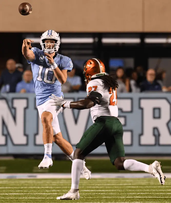 NOTES: This was the seventh time in Brown’s second stint at UNC that the Tar Heels have collected more than 600 total yards. … Maye became the first UNC quarterback to throw at least four touchdown passes in a half since Nathan Elliott did it against Western Carolina in 2017. … Seven Tar Heels scored touchdowns. … UNC cornerback Tony Grimes left the game in the first quarter with an upper-body injury and didn’t return. … One of the ineligible FAMU players was Isaiah Land, an edge rusher who is an NFL prospect. This position on the depth chart is listed as “Fang.” … Although 25 FAMU players were ineligible for the game, 70 were stretching on the field before the game. … UNC goes on the road for noon ESPNU games the next two weeks against FCS schools out of the Sun Belt Conference: Appalachian State next Saturday and Georgia State in two weeks. …There were numerous NFL scouts with Kenan Stadium press box seats reserved for Saturday’s opener: Giants, Bucs, Texans, Panthers, Falcons, Bills, Browns, Cardinals and Chargers. … Carolina is 6–4 all-time in August games, the first one a 31–9 win over Southern Cal in 1993 and the previous one a 24–20 win over South Carolina in Charlotte in 2019, the first game of Brown’s second stint at UNC.