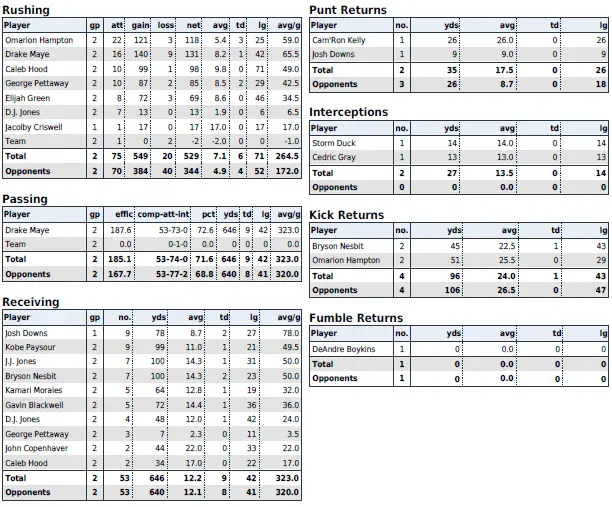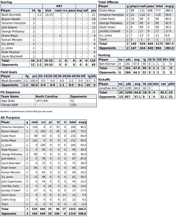 NOTES: The playing status of running back Caleb Hood, offensive tackle Spencer Rolland and wide receiver Josh Downs (lower-body injuries) will be determined Saturday. … Players of the game were quarterback Drake Maye on offense, lineman Evans on defense and kicker Noah Burnette on special teams. … Last season’s 59–17 win over Georgia State in Kenan Stadium was the first meeting between the schools. … The Panthers lost their opener Saturday at South Carolina 35–14. … On the ESPNU call of the game will be Clay Matvick, Rocky Boiman and Dawn Davenport. … The 124 combined points in the App State game were the most in UNC program history.