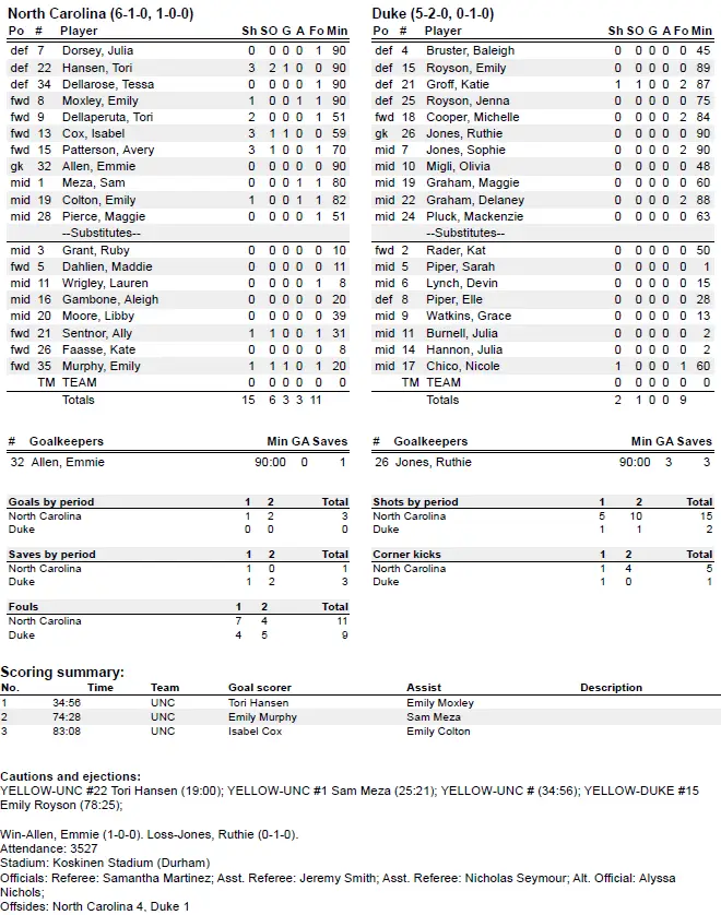 No. 2 UNC (6–1–0) seized control with the senior defender’s first-half header, and goalkeeper Emmie Allen earned her first career shutout in a dominant 3–0 victory Thursday night over No. 3 Duke in a non-conference game.
