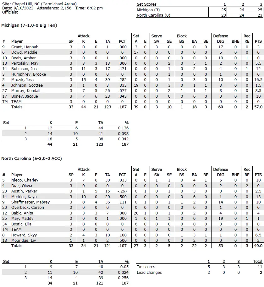 NOTES: Carolina plays its next three matches in Richmond, facing Old Dominion and VCU on Friday and Maryland-Baltimore County on Saturday. … Merkler led UNC against Michigan with 10 kills, with May getting 19 digs. … UNC leads the series with Michigan 5–3 and had won the previous three meetings.