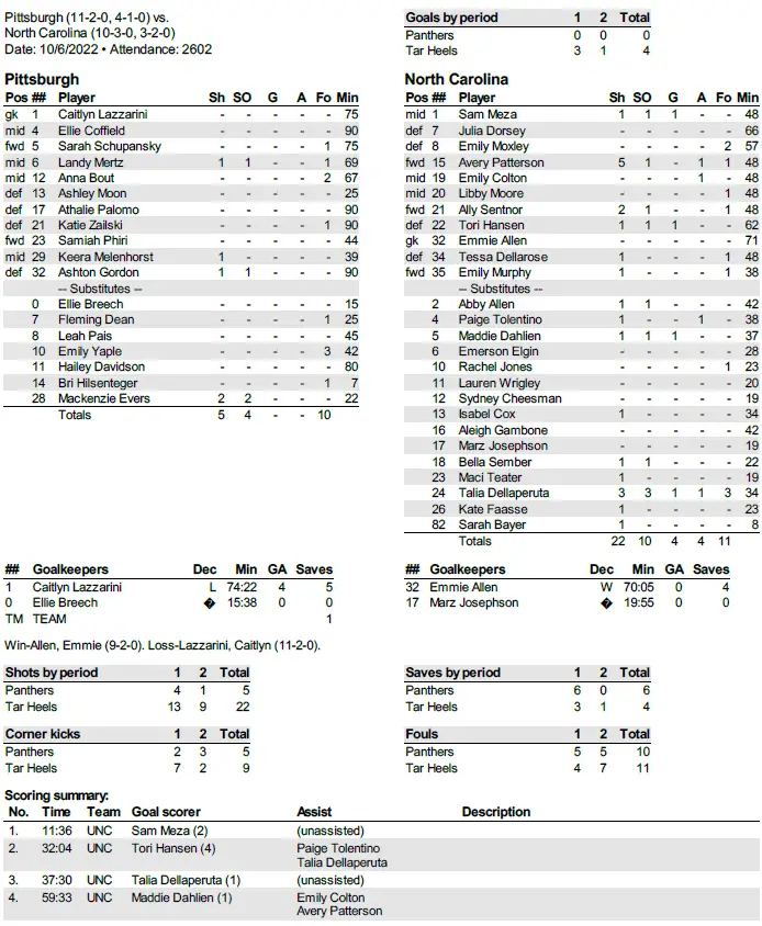 NOTES: The most goals an opponent had previously scored on Pittsburgh was in a 3–2 road loss to VCU, its only previous defeat. The Panthers are a win away from the most victories in program history. … UNC leads the all-time series with Pittsburgh 6–0, including 3–0 at Dorrance Field, and has outscored the Panthers 14–1. … Fifth-year forward Rachel Jones played in only her second game of the season after offseason surgery to repair a labrum tear. … Carolina continues its three-game homestand Sunday at 1 p.m. against N.C. State (7–4–3, 2–3–0 after losing Thursday at No. 17 Notre Dame 3–0) and Friday, Oct. 14, against Wake Forest (8–3–3, 2–4–0 after falling 2–1 Thursday at No. 7 Duke), its final regular-season home game. Both games will stream on ACC Network Extra (ESPN3). … UNC forward Tori Dellaperuta, Talia’s younger sister, is in Italy trying out for the Italian national team and missed her second consecutive game. She’ll also miss Sunday’s game. … The Tar Heels are one win shy of 400 all-time home victories combined at Dorrance Field, Fetzer Field, Finley Field and the soccer park in Cary.