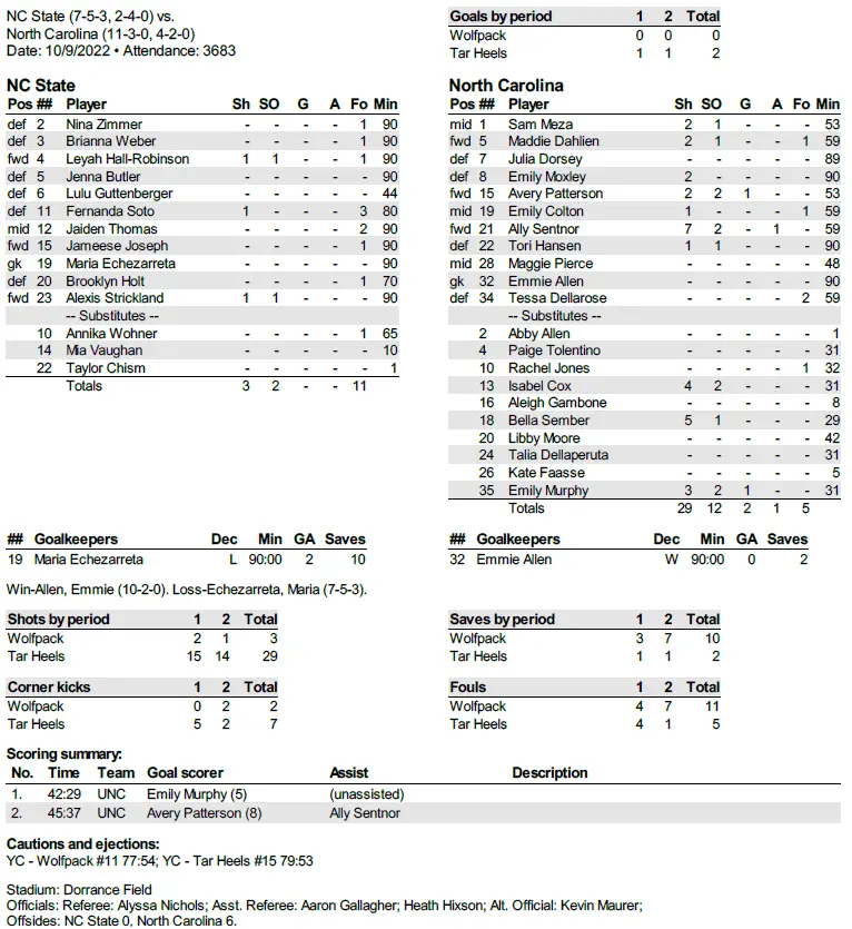UNC goaltender Emmie Allen needed only two saves to get her third shutout of the season. State got off two shots, marking the 10th time this season that UNC has held an opponent to seven or fewer shots and the sixth time an opponent has had five or fewer shots.