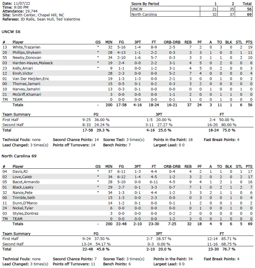 Coach Davis, without Puff Johnson (knee), seemed more intent on letting his regulars find a rhythm, which was hard for them against UNCW. The Tar Heels didn’t start to take control until they turned up the defense in the second half as UNCW went from shooting 36% in the first half to 24.2% after halftime.