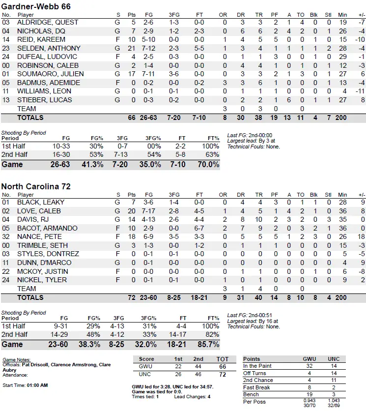 Thanks to Nance scoring 16 of his 18 points — along with three 3-pointers and three blocks — in the first half, UNC led by four at halftime. It didn’t turn into the expected blowout, though, as Carolina wasn’t a lot better in the second half before it held on for a 72–66 victory Tuesday night over winless Gardner-Webb (0–3).