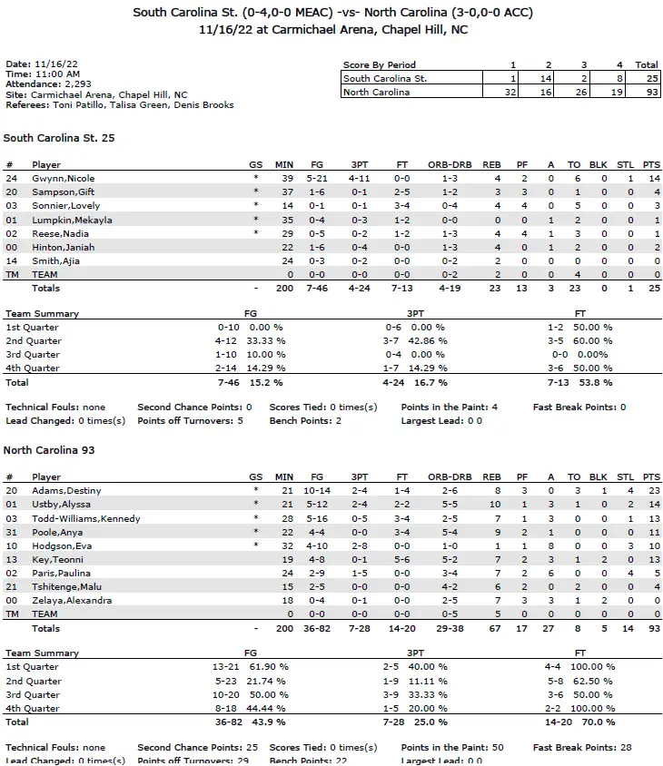 The Bulldogs went scoreless for 9½ minutes after scoring an early free throw and trailed 31–1 after the first quarter, setting a UNC school record for the fewest points allowed in a quarter. South Carolina State finally got some offense going in the second quarter but trailed 48–15 at halftime and was outscored 26–2 in the third quarter.