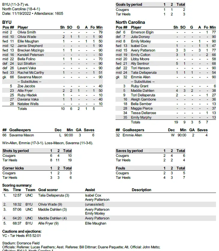 Carolina’s back line did a good job keeping BYU to only one first-half goal, considering that the Cougars had possession 52% of the time. For the game, UNC had it 51% of the time.