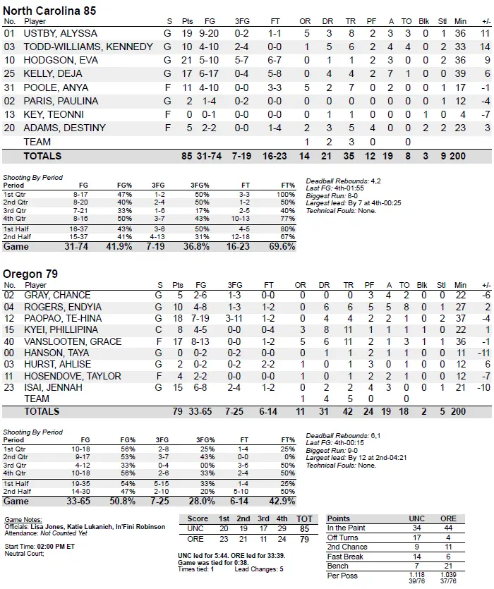 Oregon jumped out to a 7–0 lead, but UNC responded with eight consecutive points, capped by Todd-Williams’ 3-pointer. The Ducks led 23–20, though, after the opening quarter.