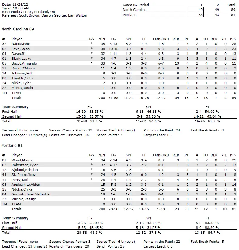 Nance matched his career-high with 28 points (with a career-high five 3-pointers) and Love added 16 of his 23 in the first half as the Tar Heels finally held off hot-shooting Portland for an 89–81 victory in the first round of the Phil Knight Invitational at the Moda Center in Portland, Ore.