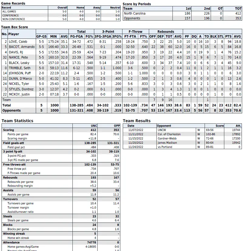 Portland (4–3) shot 48% from the floor but made only one of its last eight shots. UNC shot 53% from the floor and 50% from 3-point range (11 of 22). Carolina outrebounded the Pilots 39–23.