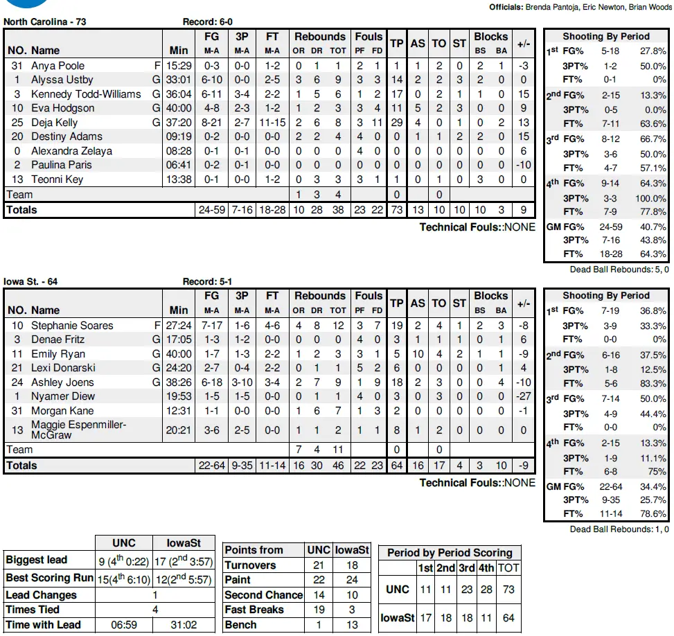 As is often the case, Carolina won it with tough defense, holding Iowa State to 13% shooting in the fourth quarter after the Cyclones shot 40.3% in the first three quarters. Cyclones star Stephanie Soares scored a team-high 19 points, but only had five after halftime. She picked up her fourth foul with 6:28 left in the third quarter and Iowa State leading 41–27.