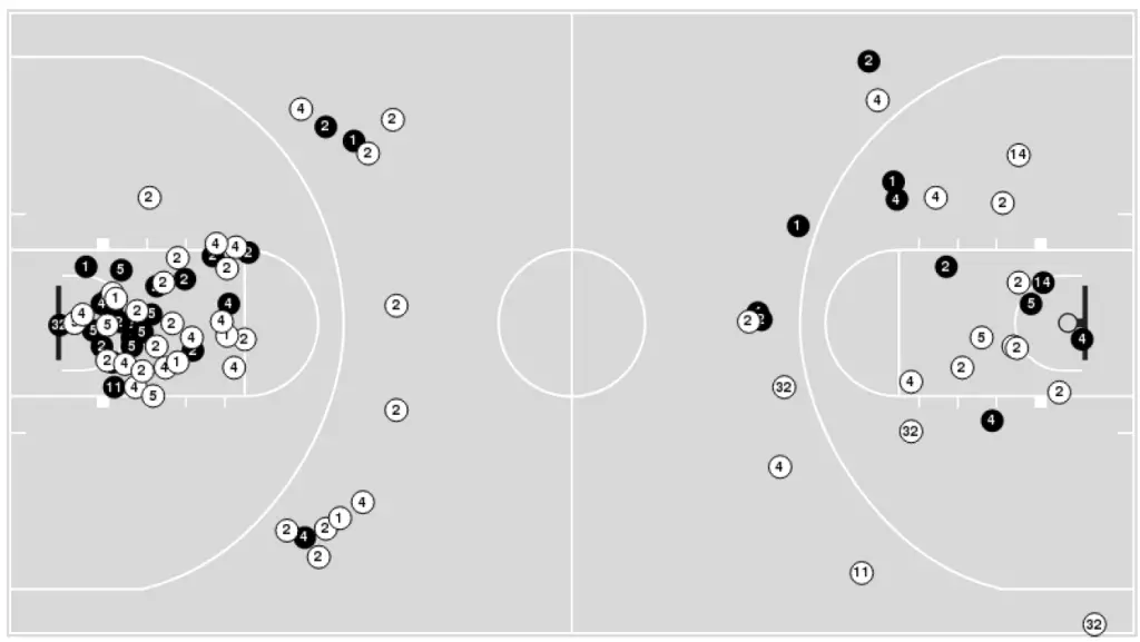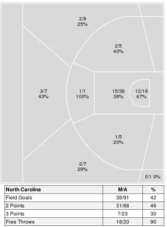 The below graphic showing Carolina’s shooting percentage broken down by where the shot went up also shows the same dynamic (except for straight-away 3-point attempts).