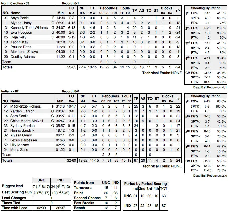 Rough shooting nights for Deja Kelly (3 of 12 for 11 points) and Alyssa Ustby (4 of 15 for 8 points) also made it tough for UNC to stay with Indiana. Kennedy Todd-Williams scored four of the Tar Heels’ 3-pointers and led them with 20 points to tie her career-high she scored six games earlier.