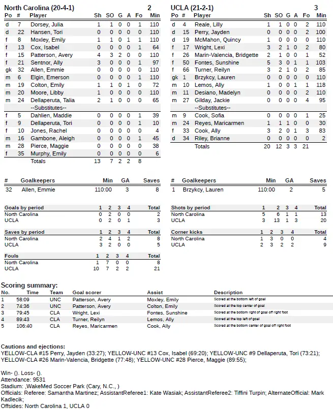 NOTES — UCLA became the first women’s soccer program in NCAA history to win the title with a first-year head coach. … UCLA outshot Carolina 17–8 after halftime. … This was UNC’s 27th NCAA championship game appearance (and 28th national final, including AIAW) and third in the last five years. … Carolina outscored its opponents in the NCAA tournament 18–8. … This was the second meeting of the season after the Bruins rallied for a 2–1 win in Chapel Hill on Sept. 4. … The win was only UCLA’s third in 16 meetings, with two coming this season. UNC still leads the all-time series 11–3–2. … The Tar Heels fell to 21–6 in NCAA finals and 22–6 in all national finals (including AIAW). … Carolina fell to 8–3 in College Cup games and 3–3 in NCAA finals played in Cary.