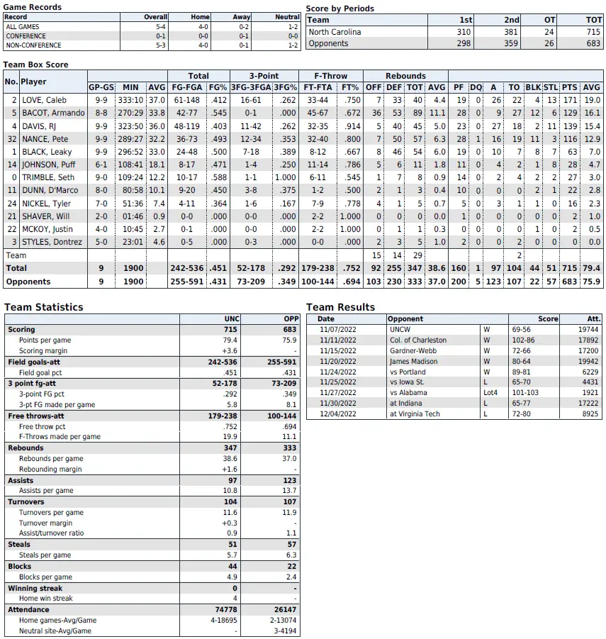 UNC is 248th out of 352 in the country in assist-to-turnover ratio (0.93 with 97 assists and against 104 turnovers). The only ACC team with a lower ratio is Louisville (0–8), which is 352nd at 0.42.