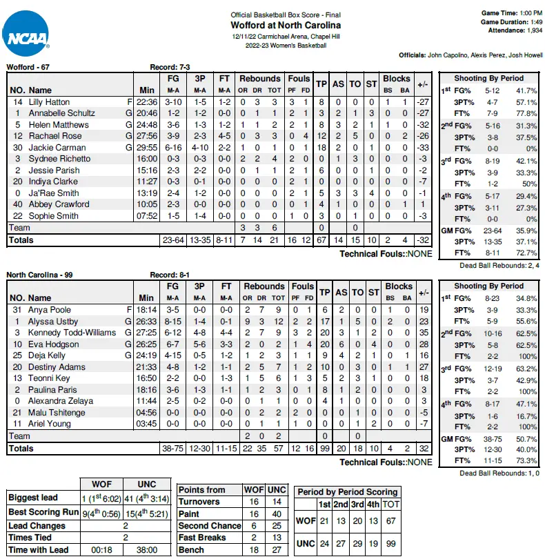 Ustby had the 19th double-double of her career, fourth of the season and second in a row by halftime. She had nine offensive rebounds (compared to seven for the entire Wofford team) as UNC owned the boards 57–21 and rebounded 59.4% of its misses.