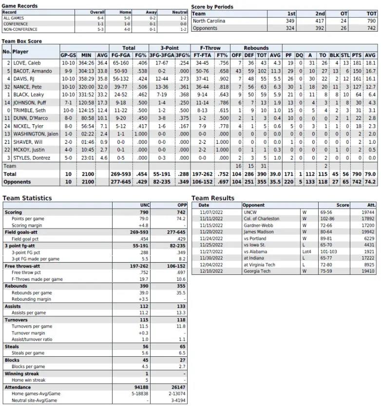 Carolina will seek its first Quad 1 win against the Buckeyes after losing its first four. The Tar Heels are unbeaten in all other games, 3–0 in Quad 2 games, 2–0 in Quad 3 games and 1–0 in Quad 4 games.