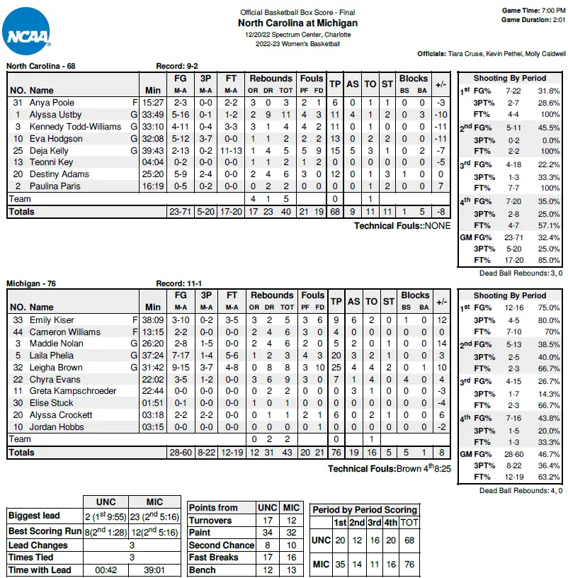 A Hodgson 3-pointer cut it to nine with 8:17 left in the game, the first time Michigan’s lead had been single digits since the last two minutes of the first quarter. Todd-Williams had a layup and a three-point play in a 7–2 UNC run to cut it to six on an Ustby layup with 10 seconds left.