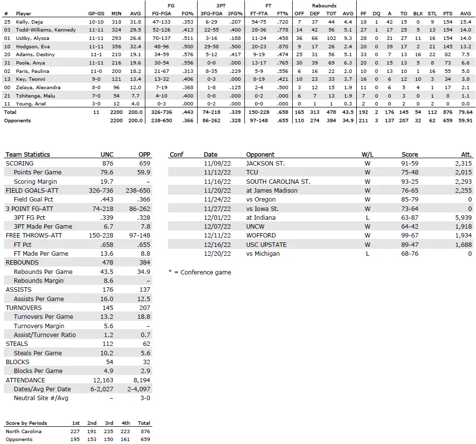 Carolina has two wins over ranked teams, beating No. 15 Iowa State (10–3, up one spot) and No. 17 Oregon (10–2, down 1 slot) in Portland at the Phil Knight Invitational. The Tar Heels’ other loss came on the road against No. 4 Indiana (12–0).