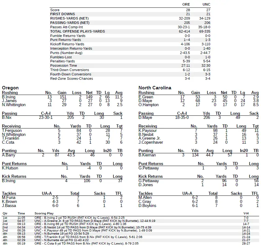 After UNC’s J.J. Jones lost his footing on the bad turf at the Oregon 1 on a potential touchdown reception, Burnette’s 34-yard field goal attempt went wide right. Four plays later, Irving ran 66 yards for a touchdown to give Oregon a 14–7 edge.