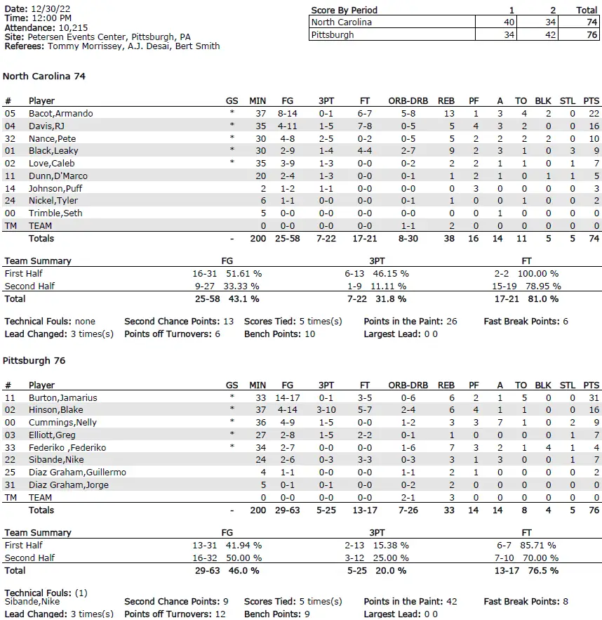 After a Bacot dunk with 11:55 left pushed UNC’s lead to nine, Pitt tied it with a 12–5 run on a Nelly Cummings jumper with 6:37 left in the game.
