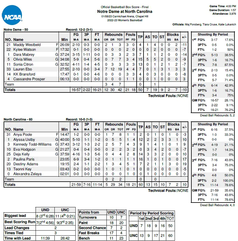 Notre Dame (12–2, 3–1) had never scored fewer than 63 points this season and was ninth in the country in scoring at 84.1 per game and fifth in shooting percentage (49.8%). But Carolina mixed up a matchup zone, varying from a 2–3 to a 3–2, with an active man-to-man to hold down the high-powered Irish offense.