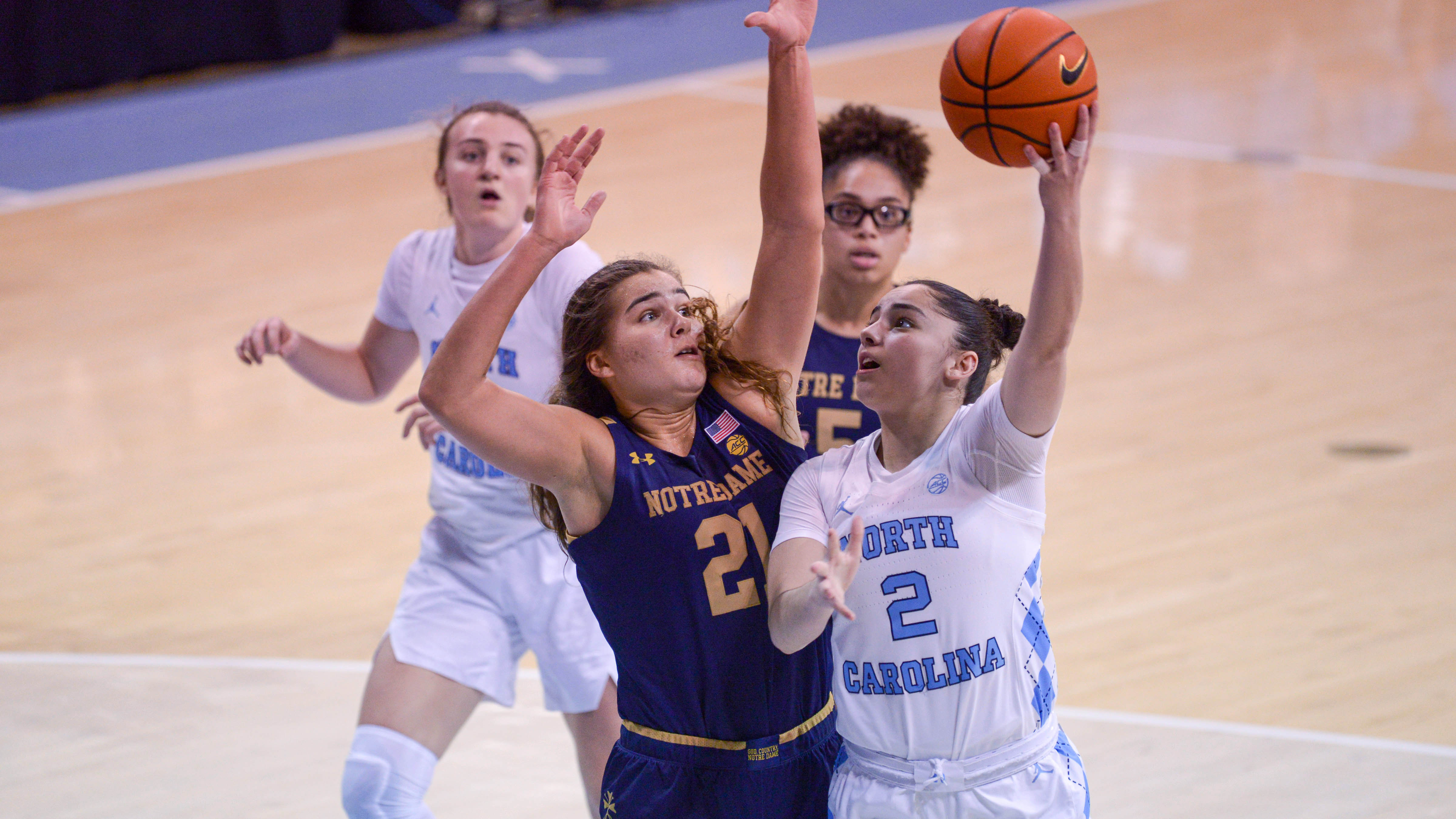 Notre Dame (12–2, 3–1) had never scored fewer than 63 points this season and was ninth in the country in scoring at 84.1 per game and fifth in shooting percentage (49.8%). But Carolina mixed up a matchup zone, varying from a 2–3 to a 3–2, with an active man-to-man to hold down the high-powered Irish offense.