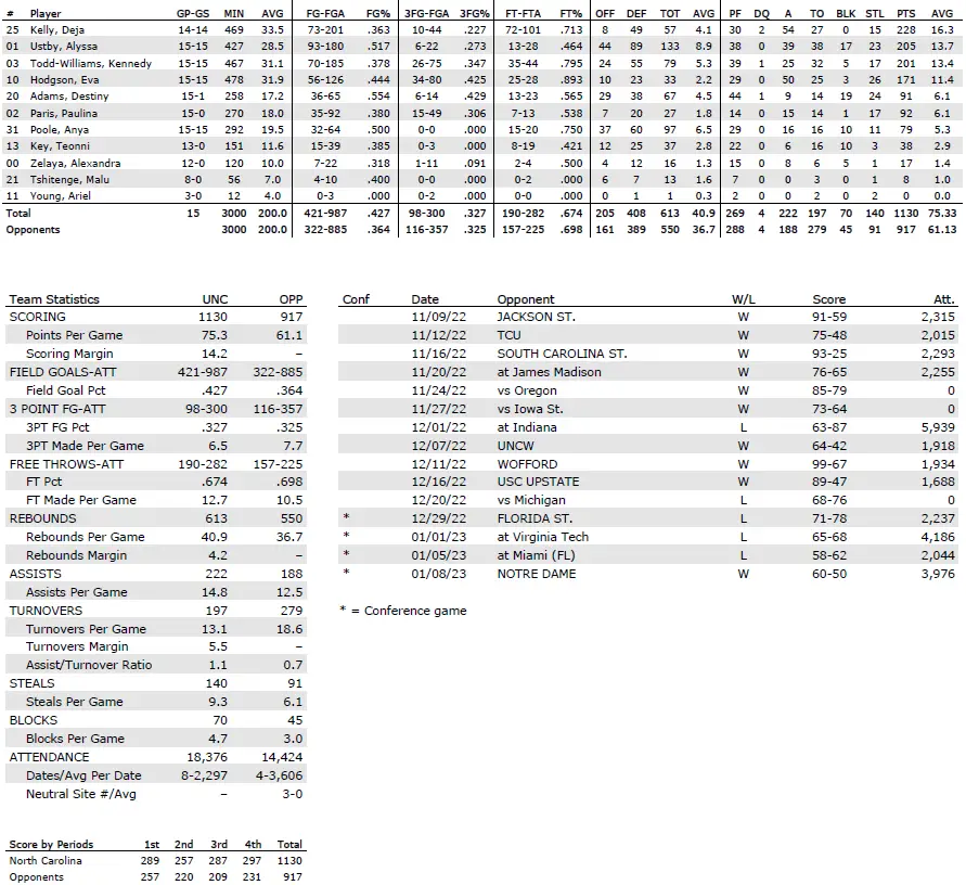 The Tar Heels (10–5, 1–3 ACC) rebounded from Thursday’s heartbreaking 62–58 loss at Miami to hand the Irish only their second loss of the season and snap a four-game losing streak behind 16 points from freshman guard Paulina Paris.