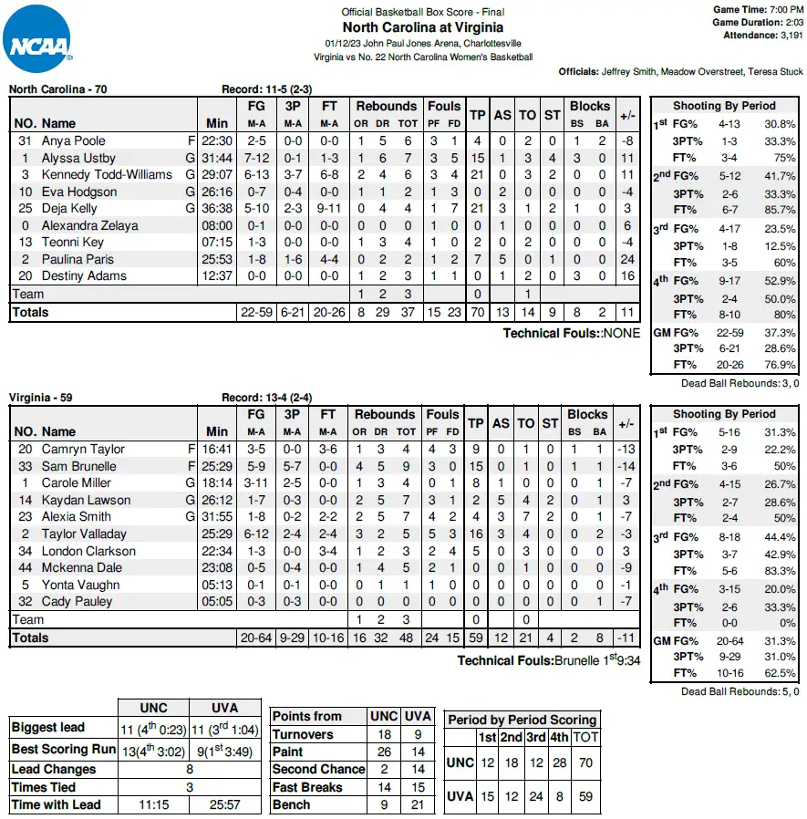 The game started oddly when, in the first 26 seconds, Virginia’s Sam Brunelle drew an intentional foul for wrapping her arms around Poole on a transition play. It was quickly 2–0 UNC after a pair of Todd-Williams free throws.