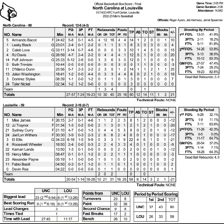 The breakout performance for UNC (12–6, 4–3 ACC) on both ends of the court, though, was from 6–5 sophomore D’Marco Dunn, who collected 14 points, two 3-pointers, five rebounds and two steals in 26 minutes, all career-highs, while playing excellent defense on El Ellis, Louisville’s leading scorer. Dunn lead all players with a +25 for the game.