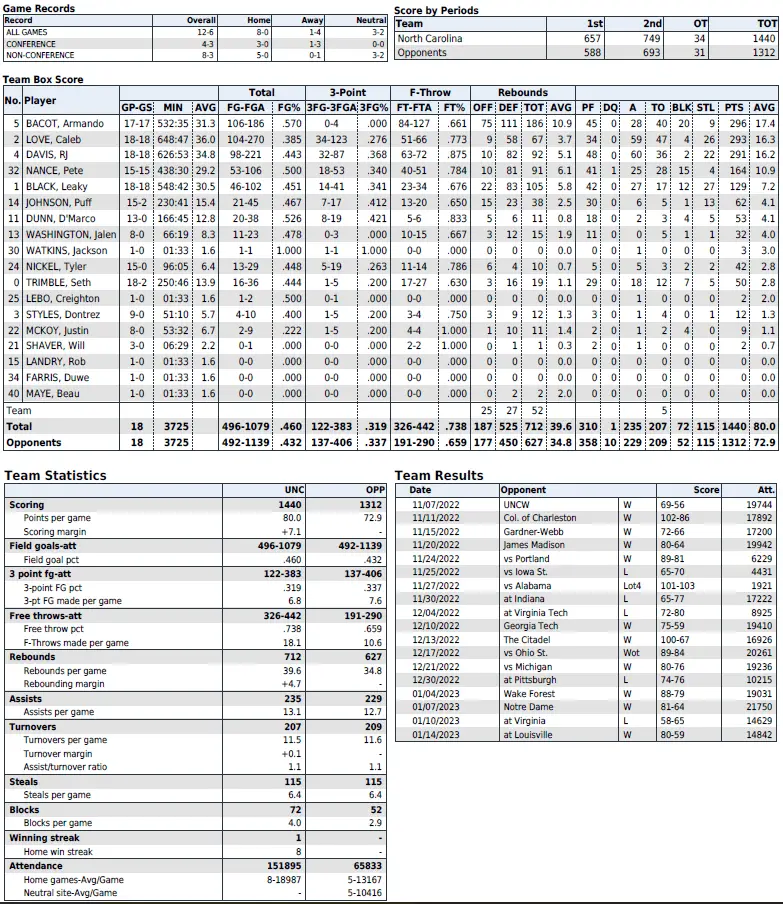 Defense fueled offense for the Tar Heels, who scored 23 points off 14 turnovers, including 11 steals. Caleb Love had a career-high five steals and Leaky Black swiped two. Carolina had a season-best 17–2 advantage in fast-break points.
