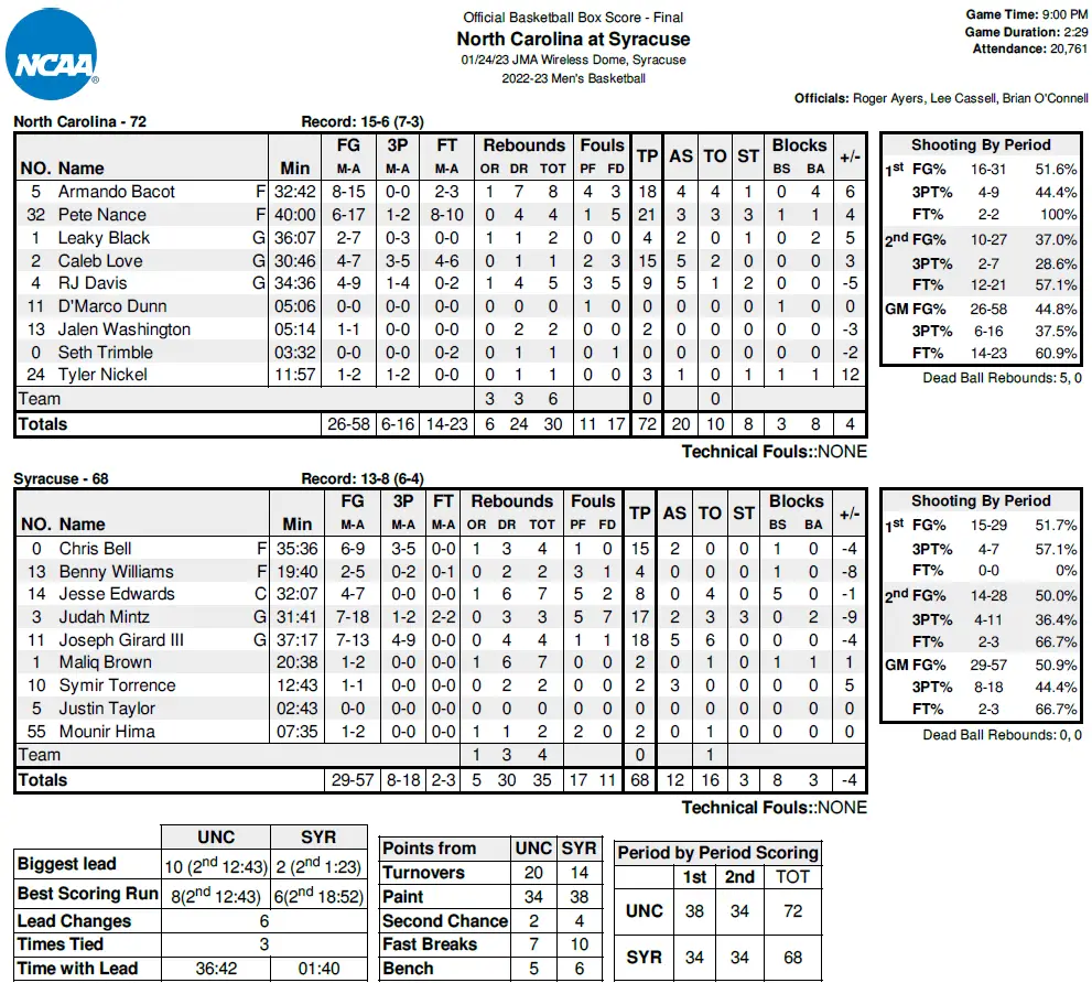 UNC shared the ball well with assists on 20 of the Tar Heels’ 26 field goals, only the third game this season with at least 20 assists (also in wins over The Citadel and Ohio State) and produce a season-high assist rage of 76.9% (previous best 75% on 24 assists and 32 field goals against The Citadel). Syracuse (13–8, 6–4) stormed back from a 10-point deficit with 12:43 left but came up short.