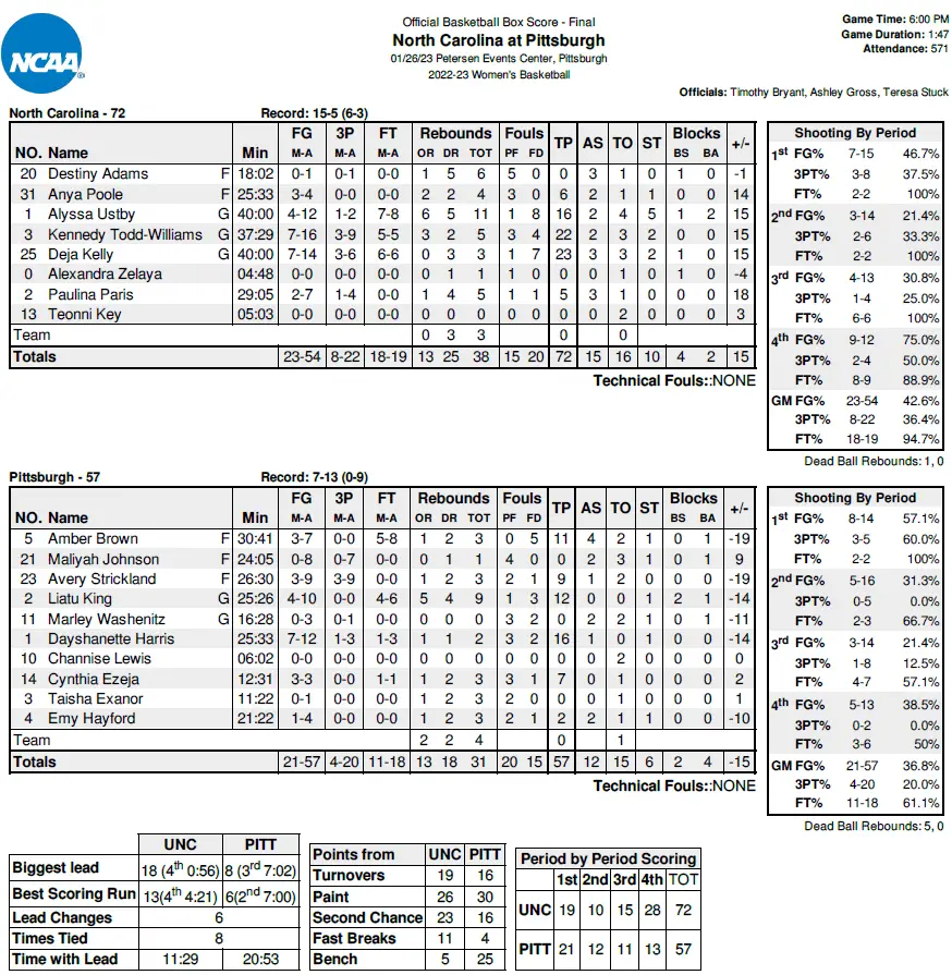 The Panthers led for more than 17 minutes before Carolina took control with a 17–1 run to start the fourth quarter as the Tar Heels won 72–57 Thursday at Pittsburgh for their sixth consecutive victory. After scoring 29 points in the first half, Carolina poured it on with 28 fourth-quarter points.