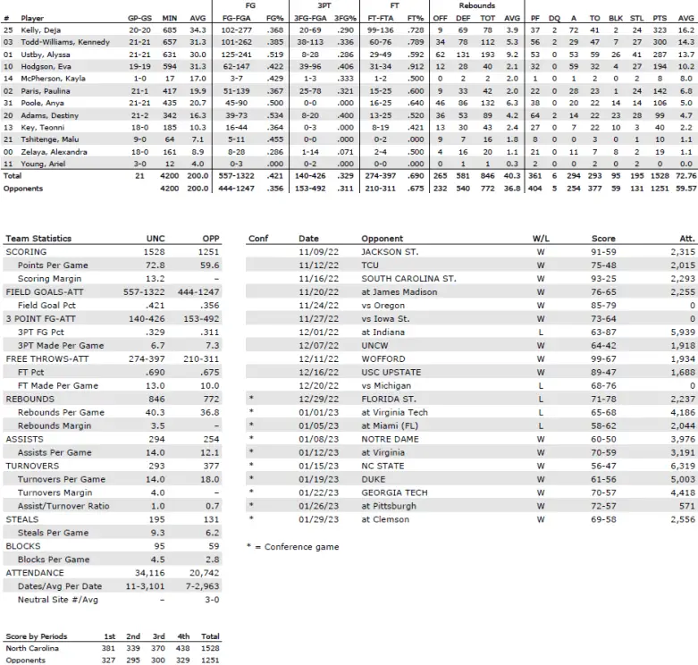 Kelly leads No. 11 North Carolina in scoring at 16.2 points per game, fifth in the Atlantic Coast Conference. She is among the ACC’s leaders in assists (seventh, 3.6 per game), assist-to-turnover ratio (eighth, 1.76), field-goal percentage (10th, 36.8%) and free-throw percentage (13th, 72.8%).