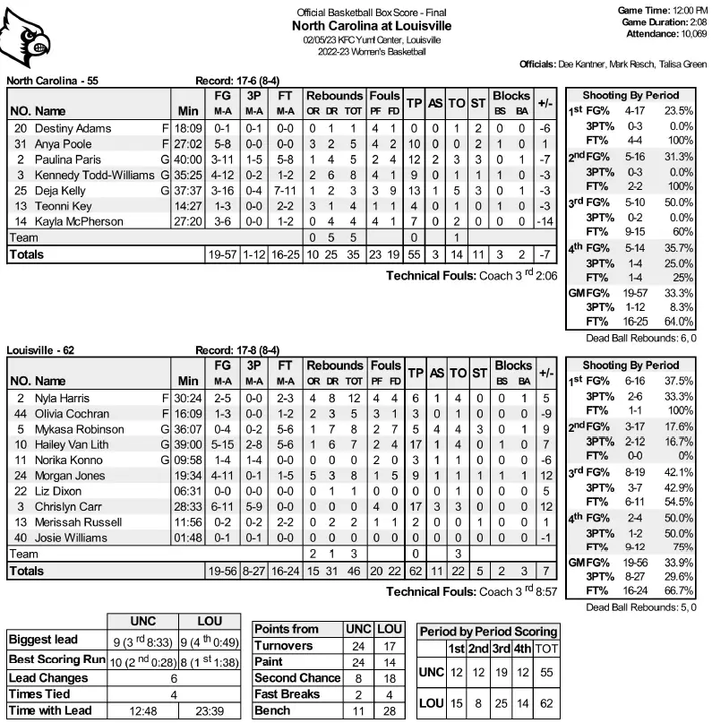 The Tar Heels battled but couldn’t overcome all that, missing Ustby’s all-around play, particularly her offensive rebounding, in a 62–55 loss in front of 10,069 fans on Denny Crum Court, ending their eight-game win streak.