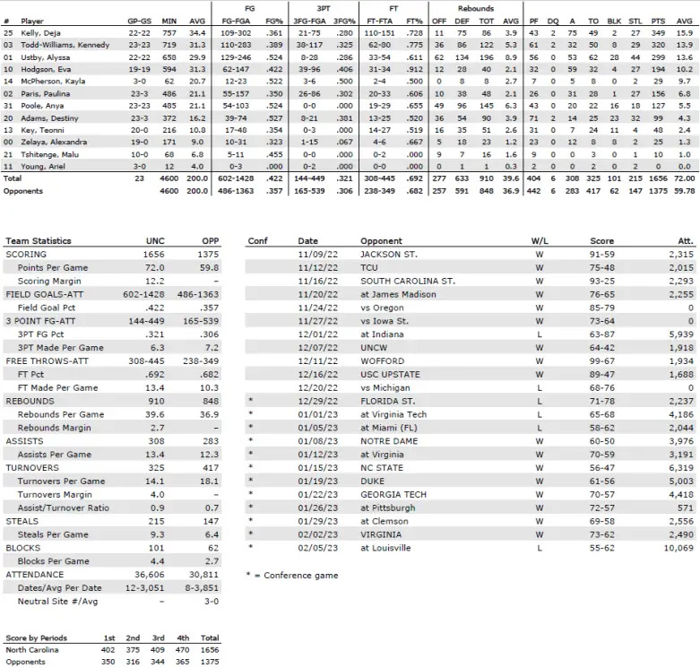 Kelly made all three free-throw attempts, Todd-Williams split a pair of free-throw attempts and Poole scored inside to give the Heels a 32–23 lead with 8:33 left in the third quarter.