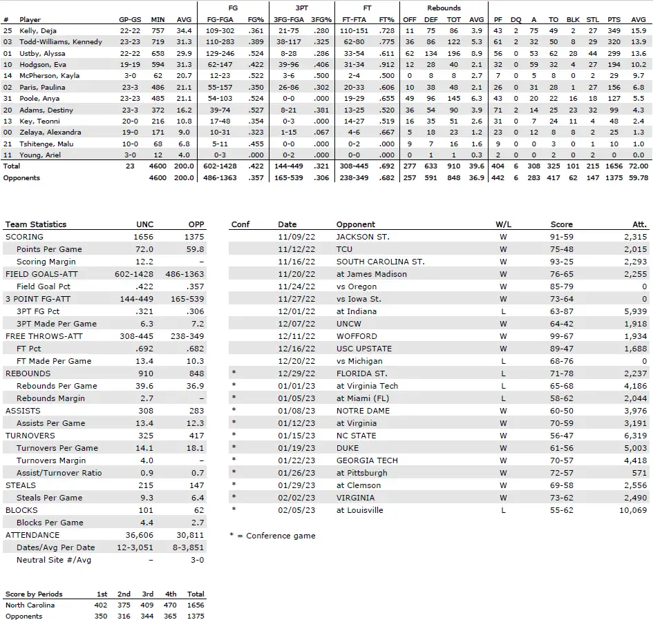 The Tar Heels (17–6, 8–4 ACC) won their eighth consecutive game with Thursday’s 73–62 home win over Virginia before the Cardinals ended the streak. Fifth-year guard Eva Hodgson (upper-body injury) missed both games, and junior wing Alyssa Ustby (lower-body injury) was out for the game against Louisville.