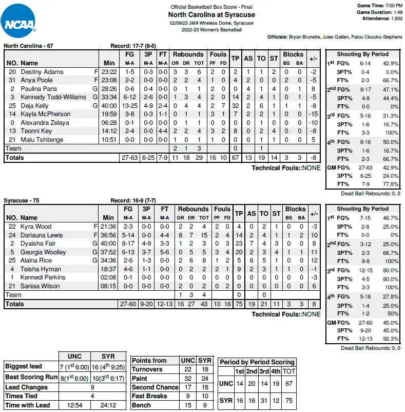 The teams traded 8–0 runs, with UNC getting four each from Kelly and Poole in its run, to put Syracuse up 11–10 with 2:42 left in the first quarter. Teisha Hyman’s 3-pointer gave the Orange a 16–14 lead after UNC had more turnovers (7) than field goals (6).