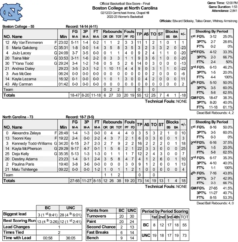 Four Tar Heels — Zelaya, Todd-Williams, Kelly and Paris —scored 3-pointers on a 14–3 run to balloon the lead to 26 points with 4:24 left in the third quarter. BC cut its deficit to 65–50 by scoring the last 13 points of the third quarter. But Carolina scored the first 11 fourth-quarter points to push the lead to 28.